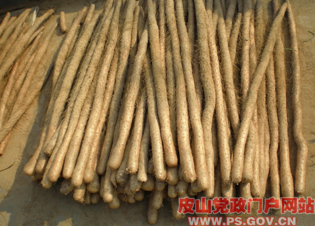 我县现有山药种植面积5000亩,年产山药15000吨,由于皮山县特殊的地理环境及土壤结构,极其适宜山药生长,所产山药不尽块大、而且肉质极其精细爽口,有清热解毒、兹阴壮阳等功效。山药淀粉具有降低血脂和血液中胆固醇含量的保健作用,可有效预防心肌梗塞、冠心病及心脑血管疾病的发生,经常食用山药,可达到益智健身、润肠养发、美容养颜的保健作用。