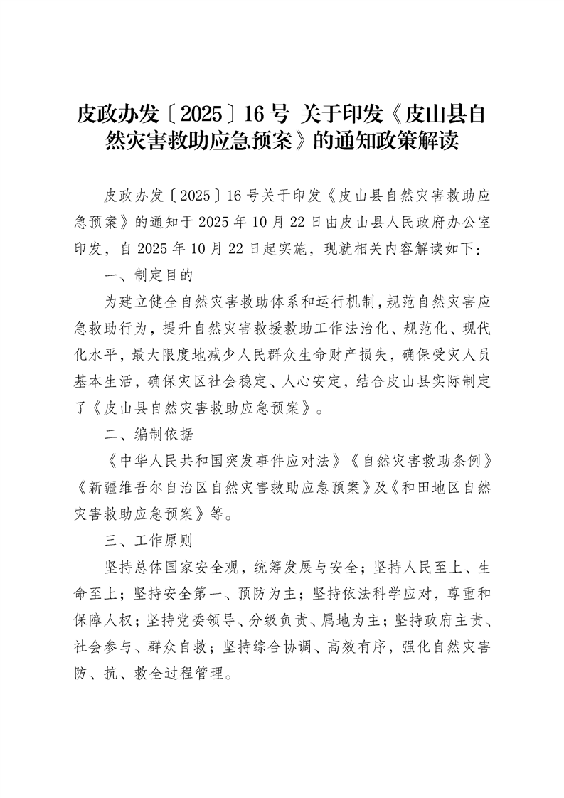 【安全生产领域政策文件】皮政办发〔2025〕16号 关于印发《皮山县自然灾害救助应急预案》的通知政策解读